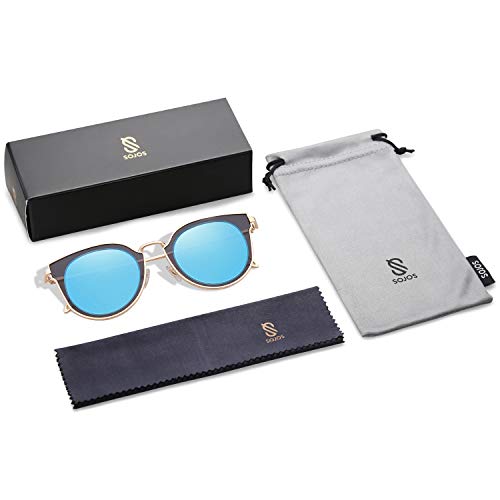 SOJOS Vogue Occhiali da Sole Uomo e Donna Polarizzati Rotondi Vintage Specchiati Montatura in Metallo Protezione UV400 SJ1057 con Oro Telaio/Blu Lente Con Custodia Morbida