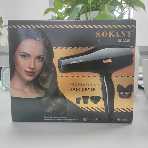 SOKANY SK-2225 Asciugacapelli Professionali Ioni 3000W, Asciugatrice per Capelli con 1 Concentratore ed 1 Diffusore, 2 Velocità/2 Temperature, Asciugatura Rapida e Delicata, Nero