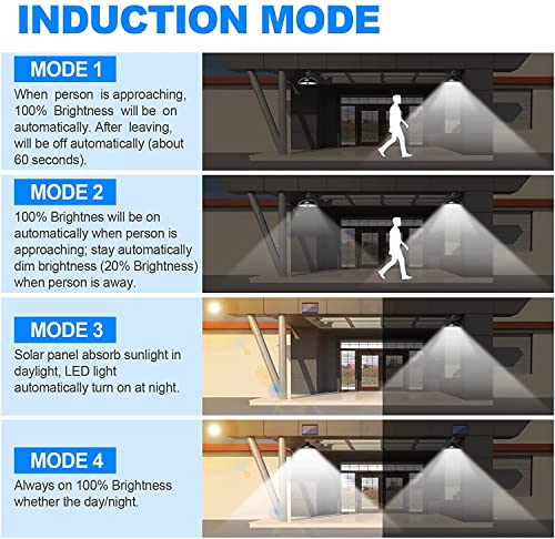【Sensore di movimento avanzato】La lampada solare per esterni dispone di 3 modalità di illuminazione: 1) Modalità sensore: si accende quando viene rilevato un movimento. 2) Luce media + sensore: bassa luce (20%) passa ad alta luce (100%) quando viene rilevato un movimento. 3.) Sensore di luce: la luce solare si ricarica automaticamente durante il giorno e si accende automaticamente di notte.