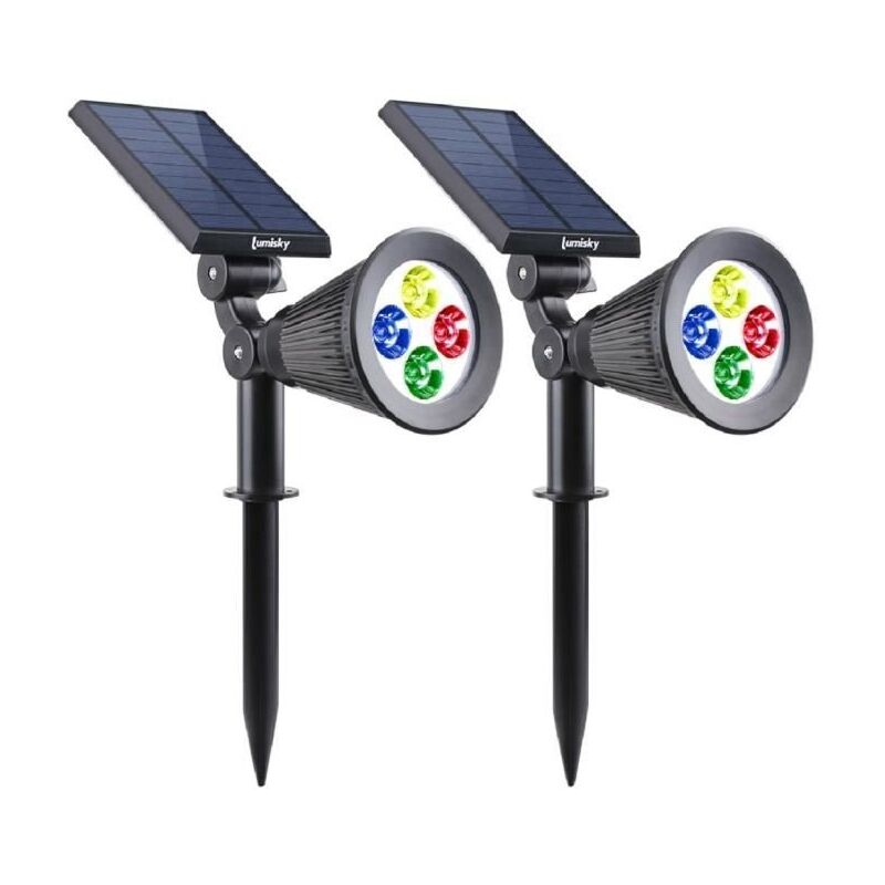 2 pack Solar Faretti impermeabile esterno - 4 LED di colore RGB - 200 lumen - Autonomia 8-10 PM - Un pavimento pianta o attaccato ad una parete - ha 2 modalità di illuminazione: debole / forte - Girare 90 ° Tete C - Set Auto Power - dotato di pannello solare - illuminazione di emergenza