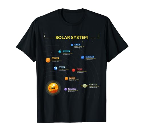 Cool solar system tshirt with all of the planets on it. This Solar System T-Shirt is a Great Gift for space enthusiasts and science geeks, or adults who is studying astrophysics, astrology, or someone who loves spaces and the planets.