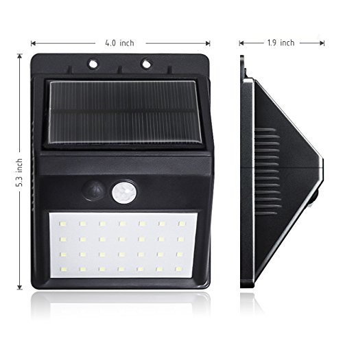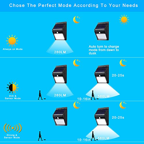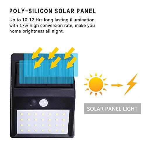 [Super luminosità del sensore di movimento solare con 28 LED]:L'ultimo aggiornato luce a parete solare con 560lm Super luminosità e grande area di illuminazione.Migliore ed eco-friendly illuminazione esterna e interna per il vostro giardino,cortile,garage,Portico,Patio,o vialetto ecc. Fornire sicurezza e sicurezza per voi a casa tutta la notte.