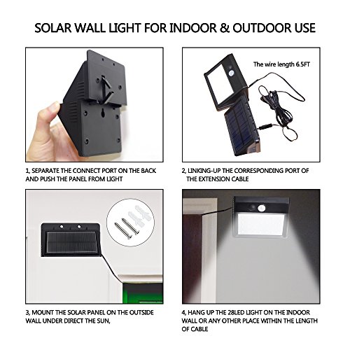 [3-modalità opzioni per illuminare la strada di casa:Con il disegno smontato,è possibile montare la luce solare sulla parete esterna,o smontare il pannello e 28 luci LED e collegarli con cavo di prolunga,quindi montare il pannello sulla parete sotto la diretta del sole e montare la luce al coperto o qualsiasi luogo che il cavo può raggiungere.