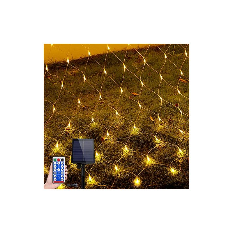 Rete di lucine a LED -- La lunghezza totale è di 6 x 4 me la lunghezza del cavo di alimentazione è di 3 m. Un totale di 480 perle di lampada di alta qualità. La linea di luce verde scuro è abbinata alla luce bianca calda, che può evidenziare l'effetto luminoso nella notte buia. Solare -- L'ultimo modello di ricarica solare con la funzione timer remoto è più comoda e più pratica senza richiedere alimentazione aggiuntiva. In circostanze normali, può essere completamente caricato per 40 ore e il vano batteria con indicatore dello stato di carica lo rende più comodo da usare. Materiale -- Che si tratti di lampada a LED perline, spina o l'intero filo luminoso, sono tutti realizzati con materiali di altissima qualità. È garantito che le luci della stringa esterne possano essere impermeabili IP44. Per una maggiore durata, si sconsiglia l'uso all'aperto in caso di forte pioggia e neve. Funzione -- Regolazione di 8 modalità di illuminazione tramite i pulsanti dell'adattatore: Combinazione