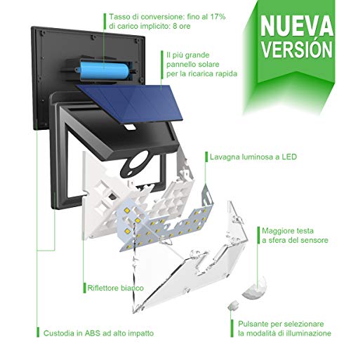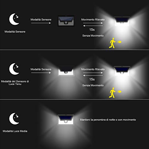 【ILLUMINAZIONE DI 3 LATI CON 24 LED TRIPLO PIÙ BRILLANTE DI ALTRI】 La luce solare esterna a LED con un esclusivo design grandangolare offre una maggiore luminosità (526 lumen). I LED negli angoli mettono abbastanza luce in più in modo che la luce solare sia molto efficiente nel suo complesso.
