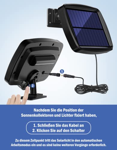 Facile da installare: puoi facilmente montare la lampada solare alla parete con le viti in dotazione, nessun cablaggio necessario. L'altezza di montaggio ideale è di 1,8 fino a 2,5 m. Questa luce solare è adatta per il montaggio su porte, balconi, garage, recinzioni, ville, scale, corridoi.