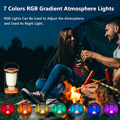 【7 Luci Atmosfera Gradiente RGB Colorate】: La luce da campeggio è stata appositamente aggiornata con luci sfumate RGB. Le luci RGB possono essere utilizzate per regolare l'atmosfera e utilizzate come luce notturna. Quando è completamente carica, la lanterna da campeggio può essere utilizzata ininterrottamente per 15 ore. È perfetto per illuminare e decorare il patio, il giardino o il patio in occasione di feste, piccole riunioni o come tavolo da pranzo o luce d'atmosfera festiva.