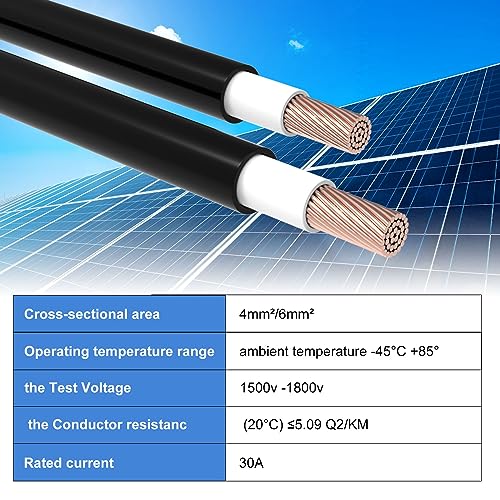 Dati tecnici: cavo solare fotovoltaico professionale, certificato TÜV, certificazione CE, IP68, sezione trasversale: 4 mm², intervallo di temperatura: ambiente da -45 °C a 85 °C, tensione di prova: 6500 V, resistenza conduttore: (20 °C) ≤ 5.09 Q2/KM, corrente nominale: 50 A, resistenza agli agenti atmosferici: UV