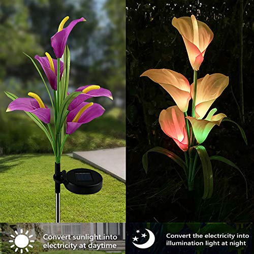 【7 colori cangianti e facile da installare】Lampada solare da giardino, con 5 lampadine LED di alta qualità. Nessun cavo o alimentazione esterna richiesta. Belle e graziose luci solari a forma di giglio Calla con 7 colori che cambiano automaticamente al buio per illuminare il tuo giardino e il tuo percorso. Perfetto come luce da vialetto e luce da terra, adatto per piantare vicino ad alberi, aiuole, recinzioni, marciapiedi, ecc.