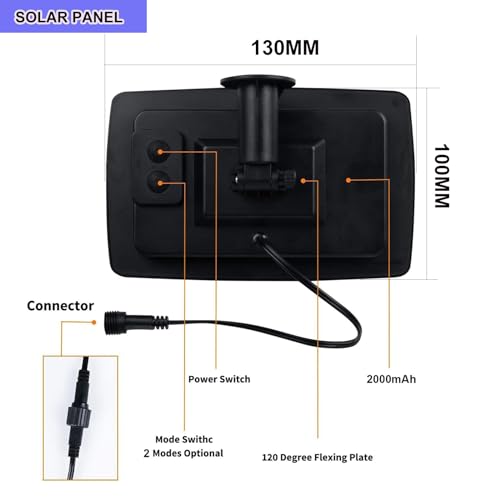 【BATTERIA INCORPORATA】 Una batteria agli ioni di litio con una capacità di 2000 mAh, garantisce un tempo di illuminazione sufficientemente lungo per i LED di notte. Si illuminerà continuamente 6-9 ore se il pannello solare viene caricato per 8 ore dalla luce solare sufficiente (si sta caricando SOLO quando l'interruttore è acceso).