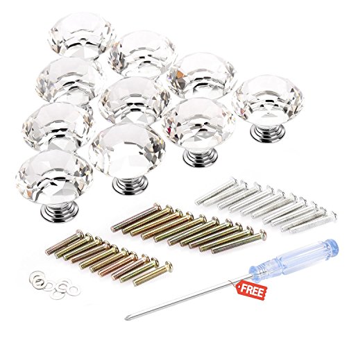 SOLEDI 10 Pomelli per Cassetti in Cristallo Maniglie Mobili 40mm con Viti e Cacciavite (a Forma di Diamante)