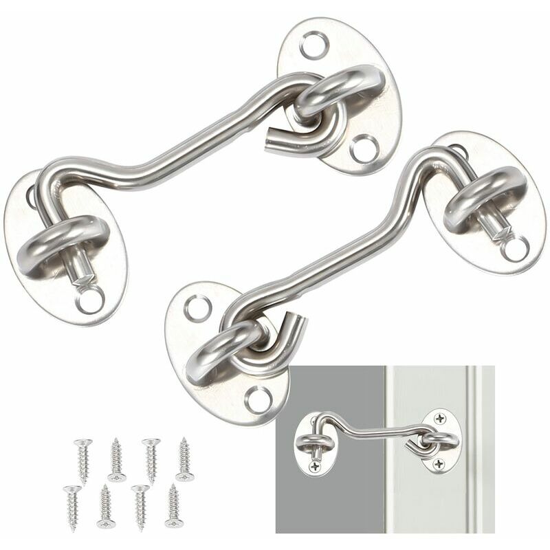 Robusto e durevole - Il gancio e il fermo sono realizzati in acciaio inossidabile di alta qualità, per garantire che non si arrugginisca e una lunga durata. Diametro del corpo principale del gancio per cabina: 6 mm / 0,24", lunghezza: 100 mm / 4". 【Funzione】 Il gancio per cabina è un buon ideale per fissare la posizione di porte, cancelli e finestre, antivento, ideale per controllare l'apertura di finestre o porte e staffe silenziose. 【Facile da installare】 Il gancio per cabina è facile da installare, ogni chiusura viene fornita con 4 viti. Il gancio e il fermo in acciaio inossidabile sono costituiti da un gancio e un lucchetto, facile da usare che ti aiuterà a fissare saldamente la serratura della porta del fienile. 【【Design perfetto per la casa】 Il gancio della cabina si adatta allo stile che cambia della decorazione domestica, qualunque stile possa essere integrato. Il gancio e il fermo possono essere utilizzati per qualsiasi spazio interno, come un garage, un ripostiglio, mobili