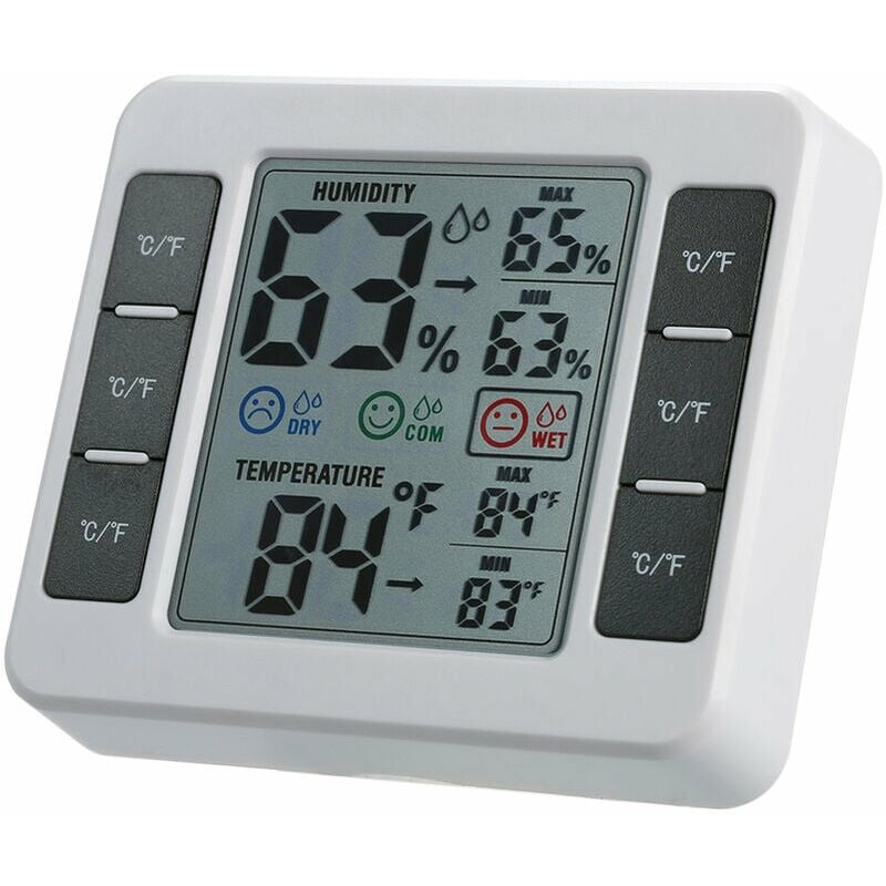 Mini termometro + igrometro con ampio display LCD, un ottimo dispositivo per visualizzare contemporaneamente temperatura, umidità e ora. Perfetto per la cameretta dei bambini, la stanza della chitarra, la camera da letto, la tenda da campeggio, ecc. È adatto per fornirti una condizione di vita digitale e mantenerti in buona salute. Caratteristiche: Termometro 2 in 1 + igrometro, un elettrodomestico perfetto può mantenere le condizioni di vita ottimali della tua famiglia. Lo schermo LCD visualizza la temperatura e l'umidità in tempo reale con la visualizzazione dell'andamento della temperatura e dell'umidità.Ampio intervallo (0~50? / 32~122?) e intervallo di umidità (20~95% RH).Lettura della temperatura massima/minima e dell'umidità interna con ? /? unità di temperatura per la selezione.3 tipi di indicazione del livello di comfort: le icone asciutto/confortevole/bagnato consentono alle persone di conoscere più facilmente la condizione dell'aria.supporto pieghevole e un foro per