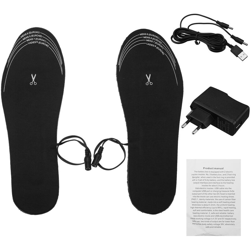 La confezione include: 1 paio di solette riscaldate 1 cavo USB 1 adattatore Specifiche: Colore: nero Materiale: fibra di carbonio Funzione: scaldapiedi Genere applicabile: unisex Tensione massima: 4,5 V Intervallo di riscaldamento: entro 35 linee di scarpe calde Spessore soletta: 4 mm / 0,20 pollici (circa) Caratteristica: -Alta efficienza di conversione, risparmio energetico, una media di un chilowattora all'ora. - Facile da tagliare alla misura desiderata. - Adatto a tutti i tipi di scarpe. -Rendi i tuoi piedi più comodi e caldi. -Design rimovibile, facile da pulire. - Caricabatterie USB, collegare a PC, laptop, caricabatterie, mantenere i piedi caldi all' interno.