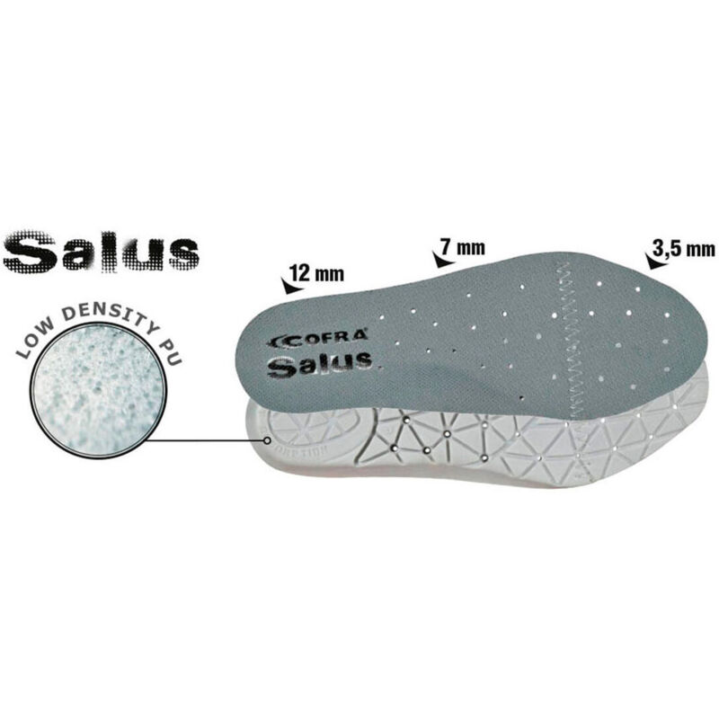 Soletta salus in poliuretano taglia 46 cofra. soletta preformata e forata, realizzata in poliuretano espanso, antistatica, in grado di soddisfare tutte le diverse esigenze di deambulazione. la linea preformata garantisce il corretto sostegno per l'intera giornata lavorativa, in ogni punto di appoggio del piede. la bassissima durezza del materiale garantisce un effetto ammortizzante, senza compromettere la perfetta postura dell'utilizzatore in ogni fase della camminata e della flessione.