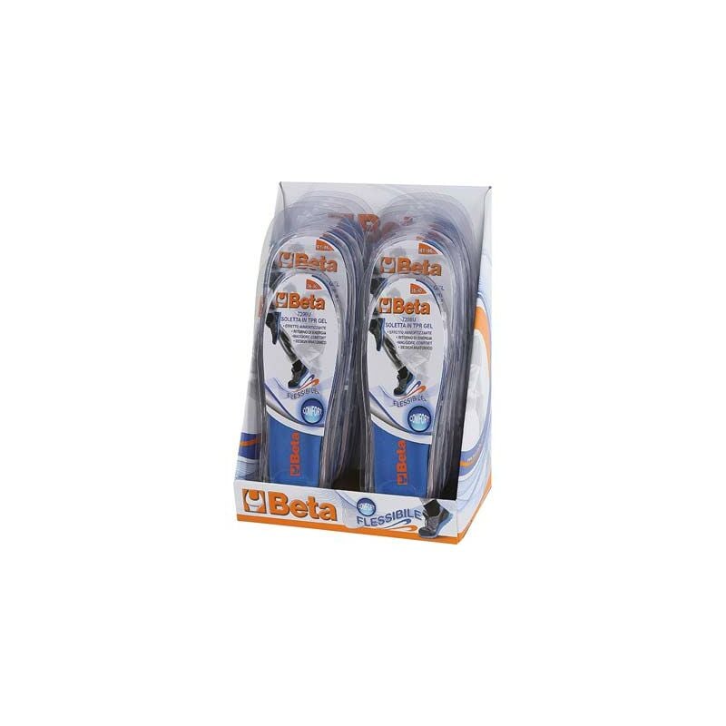 Sottopiedi anatomici in TPR GEL con elevato effetto ammortizzante, supporto dell'arco plantare e cuscinetto nella zona del tallone. In espositore da 10 paia: 2 paia per misure 36/40 e 8 paia per misure 41/46.