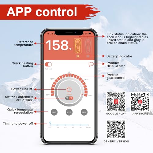 【CONTROLLO SMART APP】 Se cerchi il pulsante di attivazione/disattivazione dei solette riscaldabili nella neve all'aperto, non solo devi chinarti, ma anche rovinare i pantaloni da sci o gli scarponi da sci, il che è un'esperienza terribile. Se hai questo scaldapiedi scaldapiedi con APP, puoi regolare liberamente la temperatura delle solette riscaldabili sull'APP mobile.