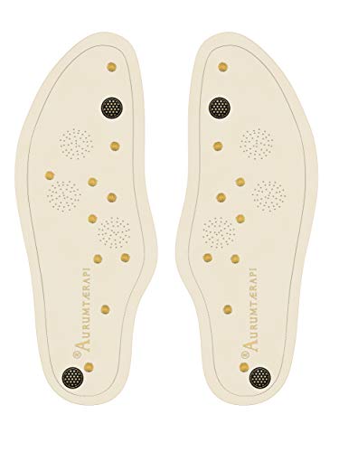 ✓: I magneti inseriti nelle solette Aurumtaerapi favoriscono il decorso di disturbi di tipo infiammatorio. La soletta è potenziata grazie all'inserimento di un magnete bagnato oro nel punto di riflesso corrispondente alla zona del Sistema Nervoso Centrale e Nervo Sciatico.
