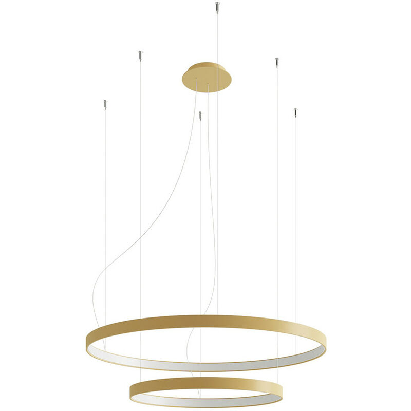 Sollux Rio Plafoniera a Sospensione Led Integrata Dorata | Finitura: dorata | Materiale: alluminio | Classificazione IP: IP20 | Altezza: 150cm | Lunghezza: 78 cm | Larghezza: 78 cm | Tipo di lampada: LED integrato | N. di lampade: 1 | Lampadina inclusa: Sì | Kelvin: 3000 K | Lumen: 9390lm | Peso: 10,65 kg | Potenza (massima): 80W
