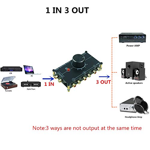 Modalità d'uso: collegare 3 sorgenti audio (come lettore CD/computer/TV) per l'ingresso RCA e un'uscita audio per l'amplificatore di potenza o altoparlante passivo