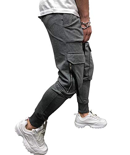 SOMTHRON - Pantaloni da uomo con tasche stile cargo, in cotone, elasticizzati, sportivi e casual, vestibilità slim fit, Grigio-6, XL