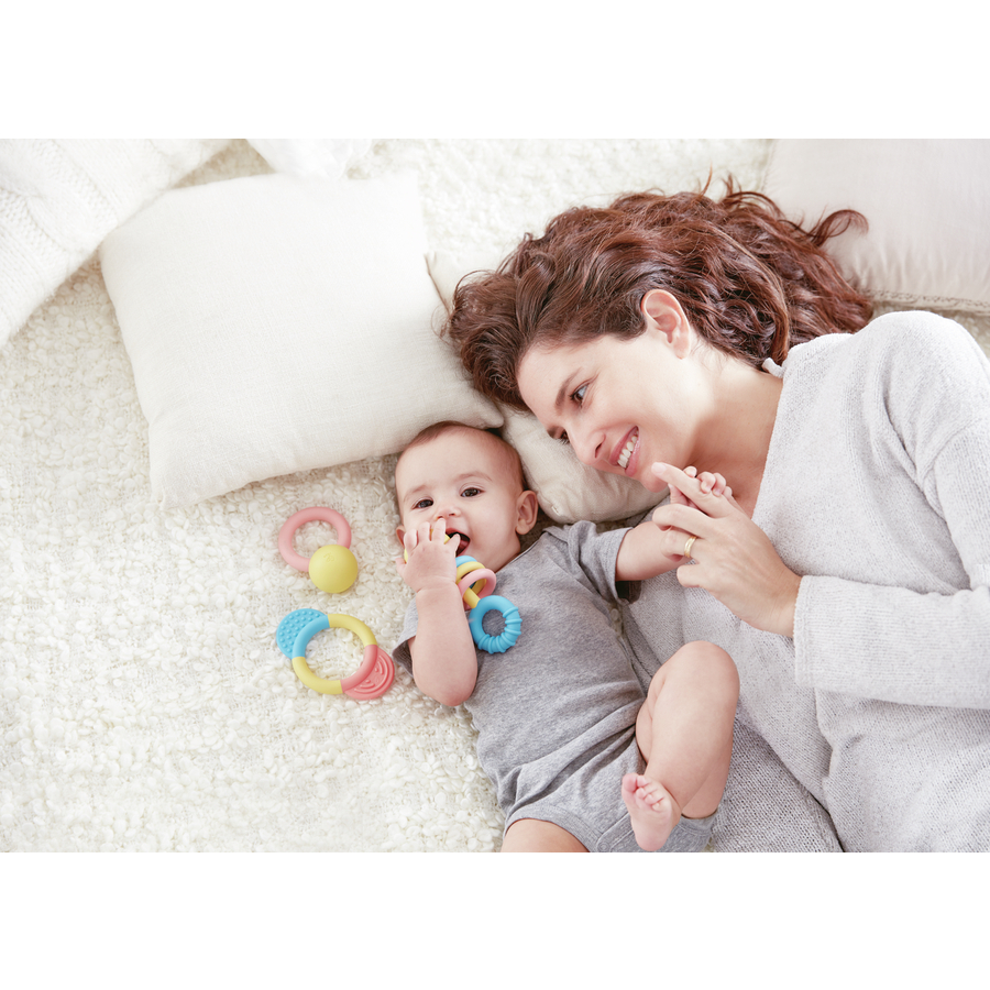 Per gli esploratori: realizzato in materiale sicuro a base di riso, questo set aiuta il bambino a sviluppare i propri sensi. È stato progettato appositamente per le piccole dita. Scuotere per ottenere un sonaglio divertente. Gli anelli mobili incoraggiano la consapevolezza tattile. Favorisce la dentizione e regala un sorriso. Dettagli del prodotto: Materiale: plastica a base di riso Facile da afferrare e comodo da tenere in mano Il leggero tintinnio stimola la consapevolezza uditiva Gli anelli mobili di diverso spessore favoriscono la consapevolezza tattile I colori tenui stimolano la vista Rispettoso dell'ambiente Età: da 0 mesi