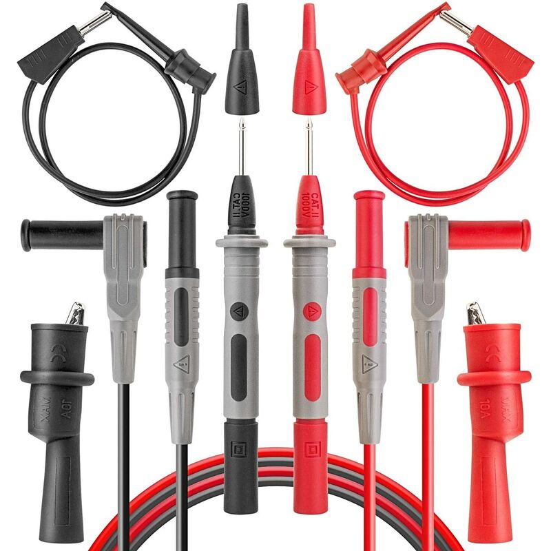 CONFEZIONE COMPLETA: Porta due clip a coccodrillo, due mini ganci, due sonde e due puntali, perfetti per un multimetro e per uso in officina o laboratorio COMPATIBILE: I connettori a banana sono standard, funzionano per qualsiasi multimetro SICUREZZA EXTRA: tutti i puntali sono completamente isolati in PVC per garantire una buona protezione