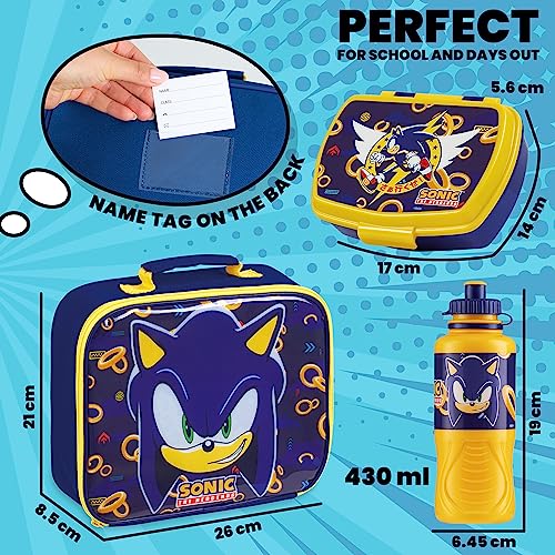 Set pranzo 3 pezzi: Questo set per il pranzo dei bambini comprende tutto ciò di cui il bambino ha bisogno per un pranzo completo in viaggio, tra cui un porta merenda bambino con zip con all'interno un contenitore porta pranzo ed una borraccia Sonic bambino da 430 ml