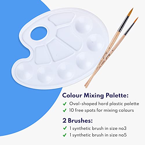 TUTTO IN UNO - Oltre ai colori stessi, il set contiene 2 pennelli di dimensioni differenti (n.3 e n.5), un album A4 per dipingere (12 fogli / 24 pagine), fatto con carta di cellulosa a 200gsm, e una tavolozza per colori ovale.