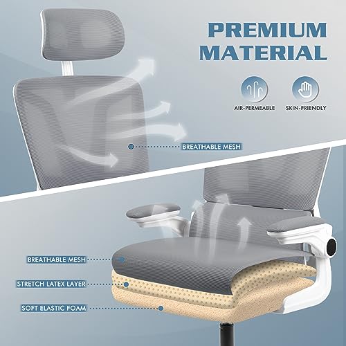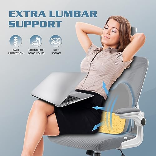 Soontrans Sedia da Ufficio Ergonomica, Sedia Scrivania con Cuscino Lombare, Braccioli Pieghevoli, Poggiatesta Regolabile, Poltrona Ufficio con Inclinazione, Regolabile in Altezza, Grigio