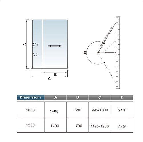 1.Parete Vasca da Bagno doccia di misura 120x140 cm (Larghezza x Altezza), regolazione: 1195 - 1200 mm, la misura è per parete doccia con tutti gli accessori installati e non per i singoli vetri.