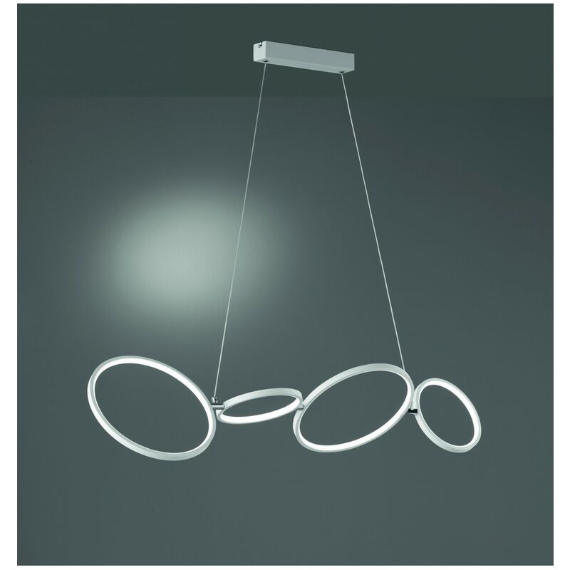 Sospensione a 4 Cerchi Led Bianco L110 cm La sospensione della serie RONDO di Trio Lighting è composta da una struttura in metallo con 4 diffusori a forma di cerchio finitura bianco opaco, interruttore a parete incluso. Dotata di modulo LED integrato da 37w - 3300lm - 3000K luce calda. Grazie alla sua dimmerabilità é possibile regolare l'intensità della luce tramite il dimmer integrato. Non compatibile con dimmer esterno. Un elemento dal design originale che non passa inosservato, ideale per illuminare e al contempo arredare con originalità ambienti in stile moderno, perfetto per il salotto, la zona living o la camera da letto. Disponibile anche la variante nella finitura nero opaco o a due cerchi. Caratteristiche: Struttura in metallo 4 diffusori a forma di cerchio Finitura bianco opaco Modulo LED integrato da 37w - 3300lm - 3000K luce calda Dimmerabile con dimmer integrato Non compatibile con dimmer esterno Design originale Ideale per ambienti in stile moderno Disponibile anche