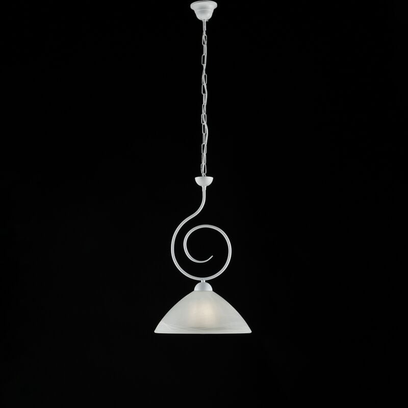Collezione Milly UNA LINEA DALL'ANIMO AVVOLGENTE Sospensione classica 1 luce in ferro battuto laccato color bianco con decorazione shabby. Un ampio diffusore in vetro alabastro bianco dal bordo liscio completao questa sospensione con una montatura aggraziata grazie ai ghirigori in ferro lavorati manualmente da mastri artigiani italiani. Con catena utile per regolarne l'altezza. La versione bianca oltre che con un arredamento classico si sposa bene anche con lo stile shabby chic. Disponibile anche nella versione marrone e oro.