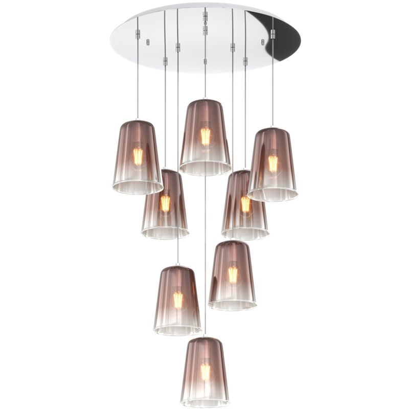 Collezione Shaded IL CONNUBIO PERFETTO TRA ARTE E LUCE Sospensione 8 luci con struttura in metallo cromo e rosone tondo e con 8 coni in vetro pirex soffiato colore rame posti in altezza differente tra di loro.. Le finiture dei vetri cromo, rame e ambra sono trattamenti superficiali sfumati verso il basso. Le strutture in metallo sono disponibili nelle finiture cromo, bianco e ottone satinato. La serie viene completata da una lampada da appoggioQuesto articolo è disponibile in diverse finiture e/o dimensioni. E' possibile indicarlo nell'apposito campo NOTE presente in conclusione di ordine oppure contattarci dopo aver effettuatol'ordine.