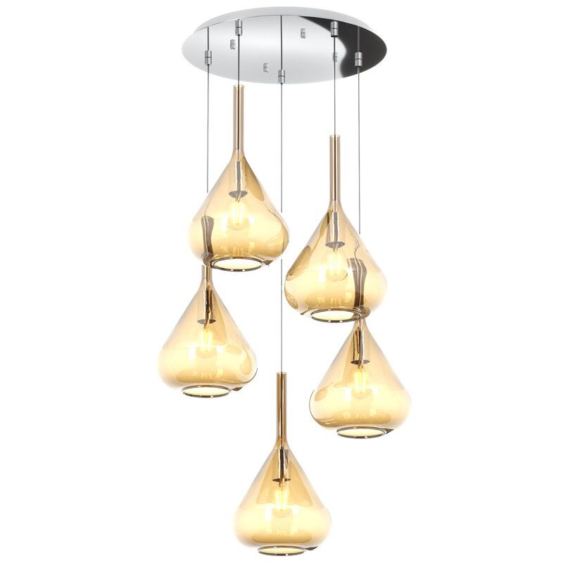 Collezione Kona LAMPADA MODERNA CHE CATTURA LO SGUARDO Sospensione 5 luci con struttura in metallo color cromo, un rosone tondo e 5 vetri pirex soffiato colore ambra come diffusore.. Le finiture dei vetri disponibili sono trasparente, verde, blu, fumè ed ambra. Le strutture in metallo sono disponibili nelle finiture cromo, bianco e ottone satinato. Nella confezione sarà compreso il portalampada nelle finiture cromo, otttone satinato e bianco, dove il cliente al momento dell' installazione sarà libero di scegliere il colore desiderato.Questo articolo è disponibile in diverse finiture e/o dimensioni. E' possibile indicarlo nell'apposito campo NOTE presente in conclusione di ordine oppure contattarci dopo aver effettuatol'ordine.