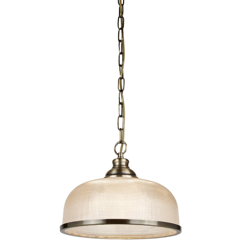 Collezione Bistrot Ii STILE VINTAGE Lascia il segno utilizzando questa attraente sospensione Bistro II, dotata di una sorprendente combinazione di ottone antico e vetro in stile olofano. Una catena spessa è sospesa al bellissimo paralume con effetto a coste con finiture in ottone antico in omaggio. Sospendere al soffitto della cucina per aggiungere un tocco tradizionale.