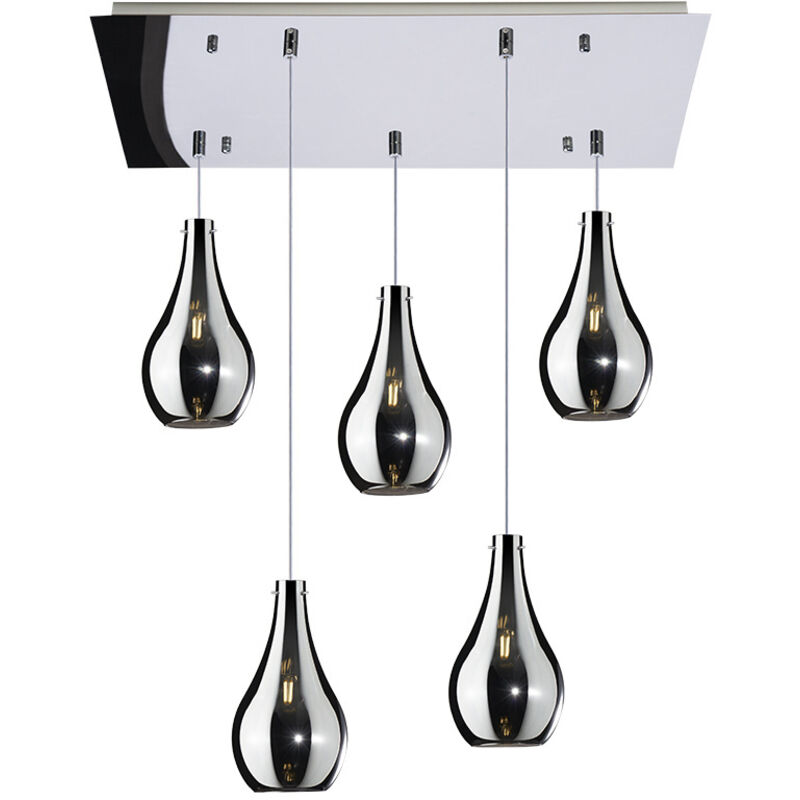 Collezione Drop AGGIUNGI UN TOCCO DI ELEGANZA SOSPESA Sospensione dal rosone rettangolare composta da struttura e rosone in metallo di colore cromo e da 5 gocce in vetro soffiato in finitura cromo.. Le finiture Cromo e Rame sono trattamenti superficiali che riducono solo parzialmente l'emissione luminosa creando delle trasparenze e degli effetti che rendono l'ambiente circostante rilassante e sofisticato. La finitura graniglia è realizzata mediante l'applicazione di granuli di vetro sul vetro trasparente che, una volta illuminato, lo rendono brillante. Le strutture in metallo sono cromate. All'interno di ciascuna confezione verrà fornita un adattatore da E14 ad E27 che permetterà l'installazione di lampadine con attacco E27. Il prodotto è disponibile anche nei colori della struttura in Ottone Satinato e Bianco e in finitura del vetro soffiato rame e graniglia. Il prodotto si presenta con 5 gocce di vetro soffiato uguali.Questo articolo è disponibile in diverse finiture e/o dimensioni.