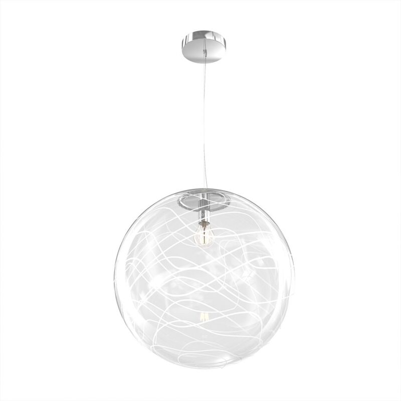Collezione Moon LUCE E ARTE, UN CONNUBIO PERFETTO Sospensione con un globo di vetro soffiato trasparente dal diametro di 40cm, impreziosito da una decorazione in filo di vetro in finitura bianco.. Creando un effetto di luce e colore suggestivo e romantico. La struttura è in metallo cromato, che le conferisce un tocco di eleganza e di modernità. Le sospensioni sono regolabili in altezza mediante dispositivi fermacavo automatici, che ti permettono di adattare la lampada al tuo ambiente e al tuo gusto. Moon è la luce che dona fascino e personalità al tuo spazio, sia che tu la usi per illuminare il tuo soggiorno, la tua camera da letto o il tuo bagno.Questo articolo è disponibile in diverse finiture e/o dimensioni. E' possibile indicarlo nell'apposito campo NOTE presente in conclusione di ordine oppure contattarci dopo aver effettuatol'ordine.