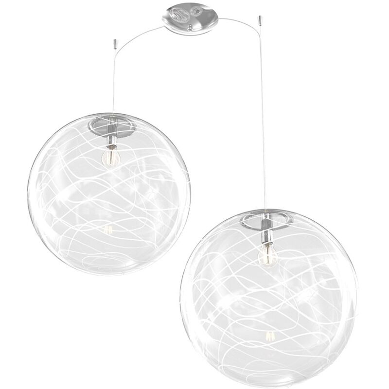 Collezione Moon LUCE E ARTE, UN CONNUBIO PERFETTO Sospensione 2 luci con decentratori, 2 globi di vetro soffiato trasparente dal diametro di 40cm.. Impreziositi da una decorazione in filo di vetro in finitura bianco, reando un effetto di luce e colore suggestivo e romantico. La struttura è in metallo cromato, che le conferisce un tocco di eleganza e di modernità. Le sospensioni sono regolabili in altezza mediante dispositivi fermacavo automatici, che ti permettono di adattare la lampada al tuo ambiente e al tuo gusto. Moon è la luce che dona fascino e personalità al tuo spazio, sia che tu la usi per illuminare il tuo soggiorno, la tua camera da letto o il tuo bagno.Questo articolo è disponibile in diverse finiture e/o dimensioni. E' possibile indicarlo nell'apposito campo NOTE presente in conclusione di ordine oppure contattarci dopo aver effettuatol'ordine.