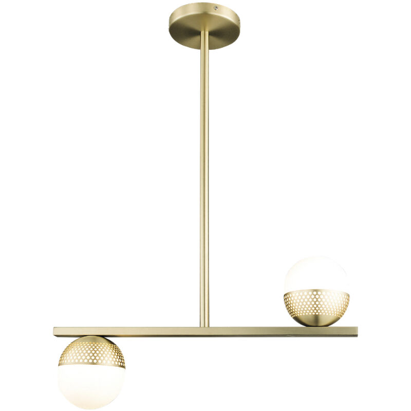 Collezione Sphiria 2 ILLUMINARE CON ELEGANZA Lampada da soffitto moderna con due punti luce LED.Elegante struttura in acciaio oro opaco con due paralumi in policarbonato opale con diametro di 10 cm posizionati in direzioni opposte, consentendo un'illuminazione verso l'alto e verso il basso.Ogni paralume è illuminato proiettando un'illuminazione omogenea di colore caldo.Installa questa lampada da soffitto disegnata da David Landis nel tuo soggiorno o camera da letto per illuminare e dargli un tocco di eleganza.