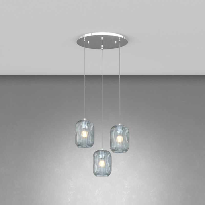 Collezione Tender UN TOCCO DI DELICATEZZA ILLUMINANTE Sospensione 3 luci con cavo regolabile e struttura in metallo colore cromo. Come diffusori 3 vetri soffiati in finitura blu.. Le finiture dei vetri sono trasparente, bianco fog, ambra, verde, blu e fumè. Le strutture in metallo sono disponibili nelle finiture cromo, bianco e ottone satinato.Questo articolo è disponibile in diverse finiture e/o dimensioni. E' possibile indicarlo nell'apposito campo NOTE presente in conclusione di ordine oppure contattarci dopo aver effettuatol'ordine.