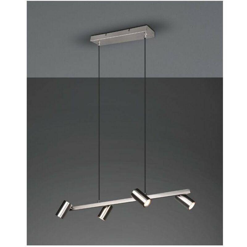 Sospensione Faretti Spot Orientabili Marley Nichel La lampada a sospensione Marley di Trio Lighting è composta da struttura in metallo di colore nichel opaco con rosone rettangolare, cavetti regolabili e 4 faretti spot cilindrici orientabili. Grazie ai cavetti regolabili in lunghezza è possibile variare l'altezza del lampadario in base alle proprie esigenze. È possibile installare 4 lampadine con attacco GU10 max 35 watt, acquistabili separatamente. Un elemento pratico e versatile, con il suo design moderno si adatta bene a tutti gli ambienti, perfetto per essere installato ad esempio nella zona living, all'ingresso o nello studio. Caratteristiche: Struttura in metallo di colore nichel opaco Rosone rettangolare Cavetti regolabili 4 faretti spot cilindrici orientabili Dimensioni: non disponibili Peso: non disponibile Materiale: non disponibile Disponibili le varianti di colore e misura e altri articoli della stessa serie.