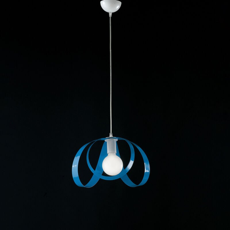 Collezione Piovra SOSPENSIONE A FASCE COLORATE PER UNO STILE UNICO E MODERNO Sospensione a 1 luce, realizzata con 3 fasce di ferro sagomate a mano e laccate color bianco e azzurro disposte attorno al punto luce. Il lampadario si adatta a tutte le altezze grazie al cavetto in acciaio regolabile in altezza;