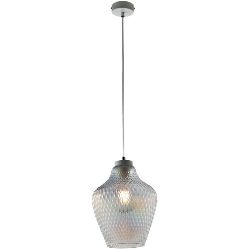 Collezione Maya DONA UN ASPETTO CONTEMPORANEO E SOFISTICATO Sospensione ad una luce in ferro laccato bianco con cavo elettrico regolabile. . Diffusore in vetro soffiato trasparente iridato con decoro in rilievo. Il vetro soffiato offre un livello di artigianalità e qualità che aggiunge un tocco di prestigio e lusso alla sospensione. Grazie al cavo regolabile, è possibile posizionare la lampada all'altezza desiderata, rendendola adatta per sopra tavoli da pranzo, isole cucina o salotti. La sospensione a 1 luce fornisce un'illuminazione mirata e può essere combinata con altre luci per creare uno schema di illuminazione complesso e ben bilanciato. Disponibile in diverse finiture.
