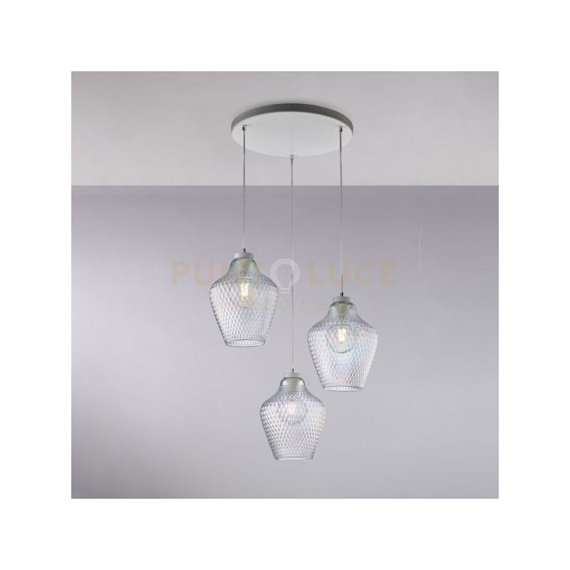 Sospensione in ferro laccato bianco con cavi elettrici regolabili e diffusori in vetro soffiato trasparente con decoro in rilievo 3 luci