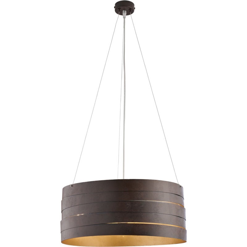 Sospensione in ferro laccato nero con decorazione esterna effetto ruggine e decorazione interna oro antico con cavi acciaio regolabili 3 luci