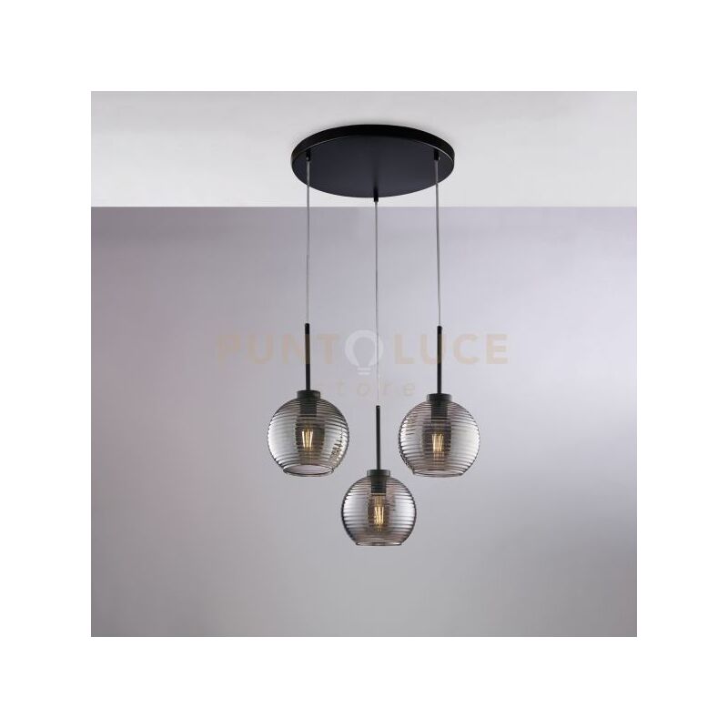 Sospensione in ferro laccato nero con cavi elettrici regolabili e diffusori in vetro soffiato grigio specchiato con rigatura in rilievo 3 luci