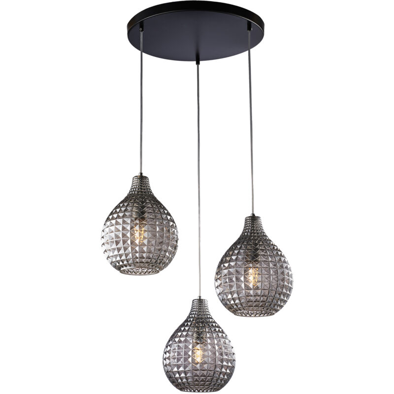 Sospensione in ferro laccato nero e montatura cromo con cavi elettrici regolabili e diffusori in vetro soffiato grigio specchiato con decoro effetto cristallo 3 luci