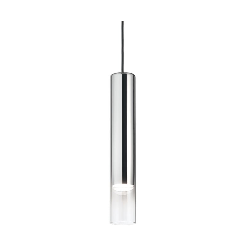 Collezione Look TUBI SOSPESI Sospensione a 1 luce con rosone e diffusore in metallo cromo sfumato. Cavo in tessuto regolabile in lunghezza. Monta lampadine sostituibili.. Disponibile in diverse finiture.