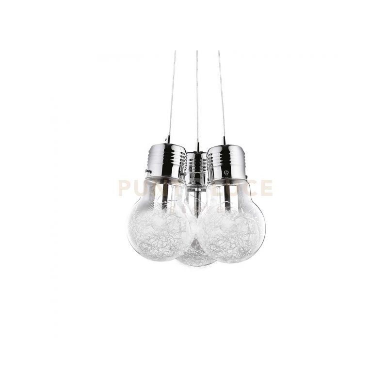 Lampadario a sospensione con montatura cromo e diffusore in vetro soffiato con decorazione interna in filo d'alluminio. Sospensioni con cavo in acciaio a lunghezza regolabile con dispositivo ferm acavo automatico.